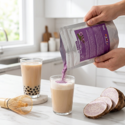 Das 100% reine lila Taro-Pulver ist eine natürliche Zutat, ideal für Getränke und Gebäck. Es verleiht eine intensive violette Farbe und einen zarten Taro-Geschmack. Perfekt für Milchtee, Desserts und kreative Rezepte, ist dieses Taro-Pulver ohne Zusatzstoffe einfach im täglichen Gebrauch anzuwenden.
